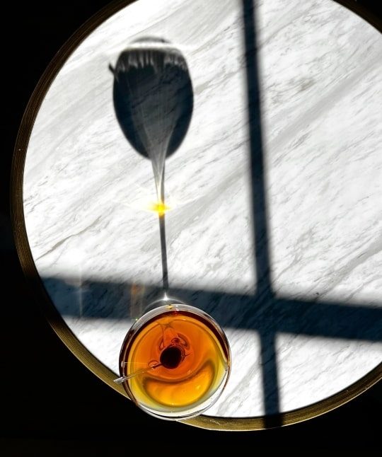 Billowing fragrant smoke, each sip more complex than the last. Basil Hayden Bourbon, Luxardo Maraschino Liqueur and Orange Bitters, Flamed Orange and Maraschino Cherry Garnish